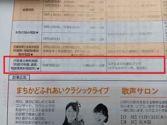 今年も恒例の行政書士会による相談会が10月18日、ながはま文化福祉プラザにて開催されます。許認可や遺言、相続などがメインではありますが他のご相談も対応可能です。